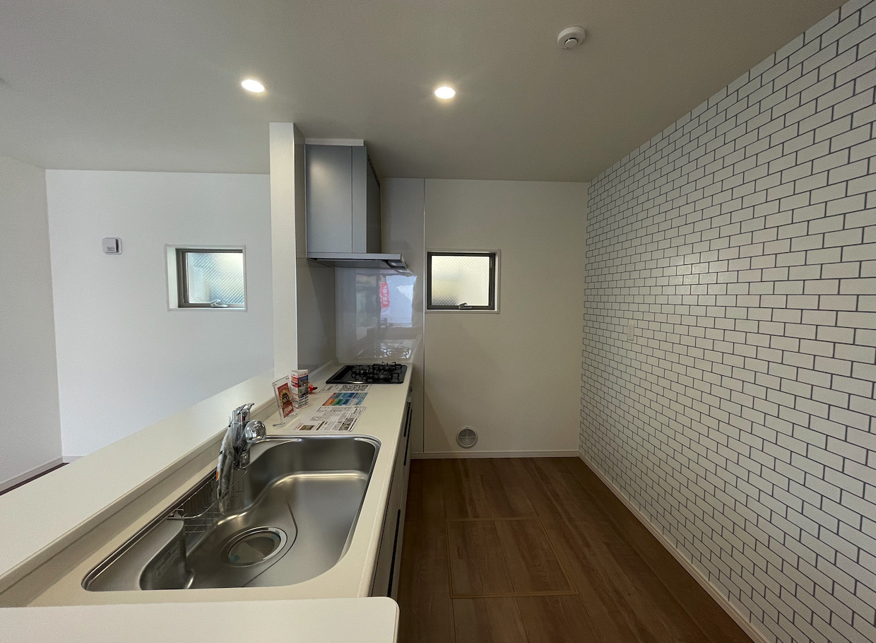 キッチンのタイル風クロスも