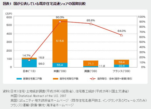 日本は国土が狭いにも関わらず新築ばかりが建てられていて中古物件は流通量全体の2割程度しか取引がありません。